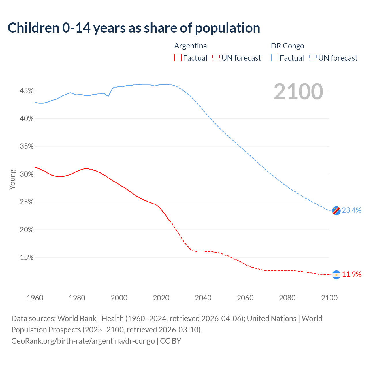 According to the latest available data on birth rates, the fertility rate in Argentina was 1.5 children per woman in 2023, compared to 6.05 in the DR Congo in 2023. The replacement level is considered to be 2.1 children per woman.