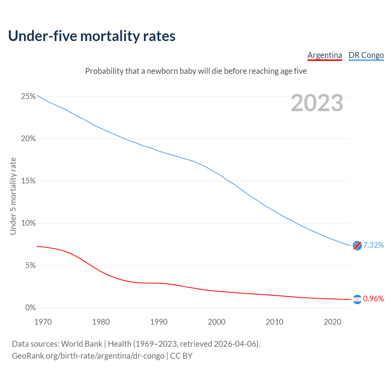 The chance that a newborn baby will die before reaching age five is 0.96% in Argentina and 7.32% in the DR Congo. Above is a chart with historical data on under-five mortality rates.