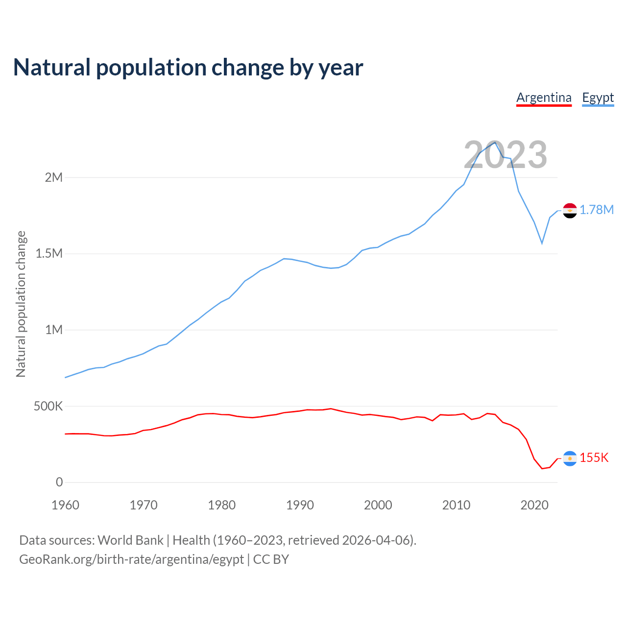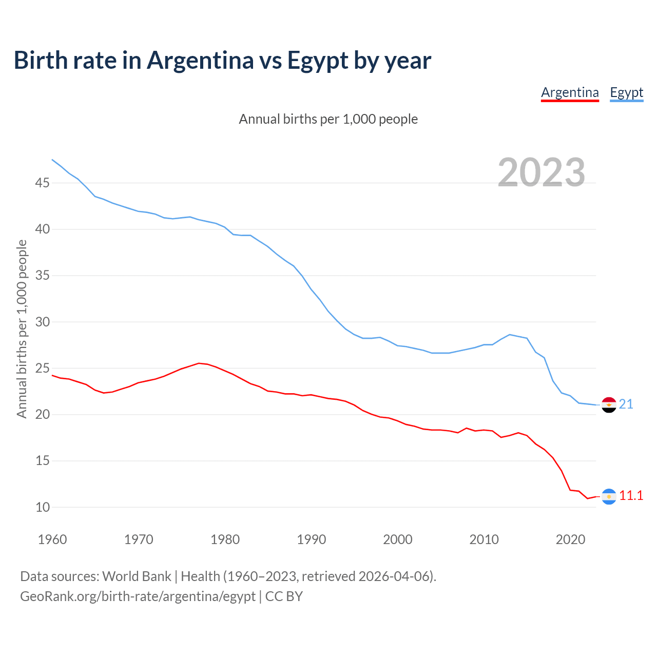 According to the latest available data on birth rates, the fertility rate in Argentina was 1.5 children per woman in 2023, compared to 2.75 in Egypt in 2023. The replacement level is considered to be 2.1 children per woman.