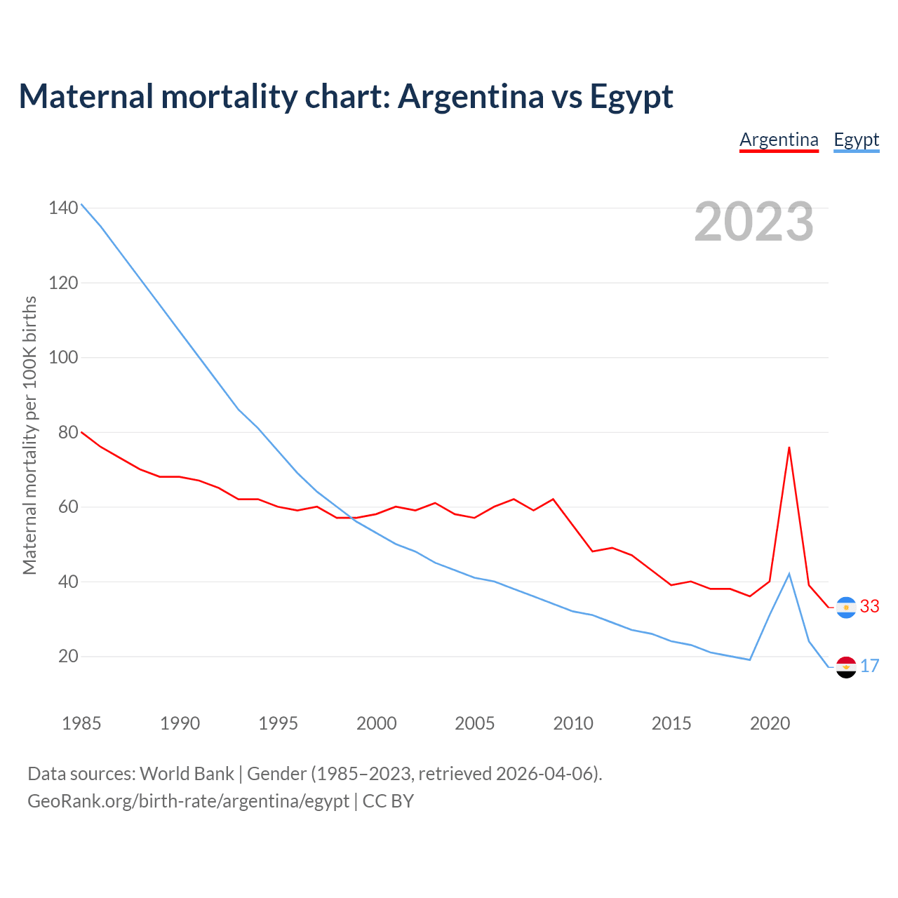 The maternal mortality rate, which is the probability of dying during childbirth or within 42 days of pregnancy termination, is 33 deaths per 100,000 live births in Argentina, compared to 17 deaths in Egypt.