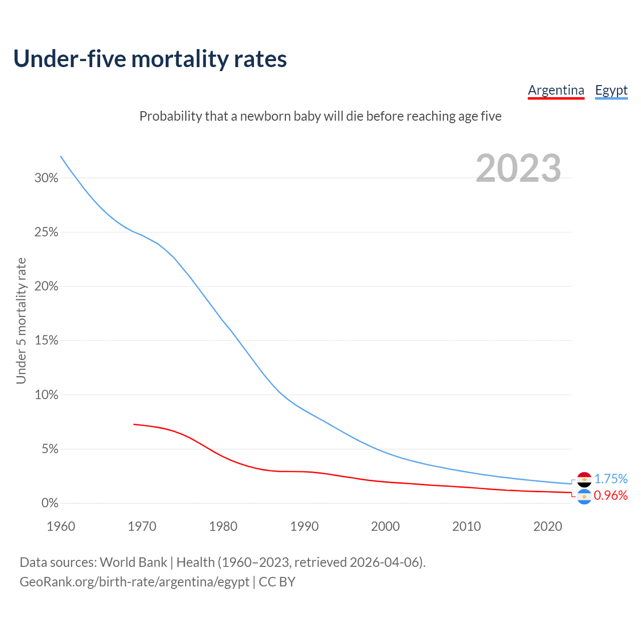 The chance that a newborn baby will die before reaching age five is 0.96% in Argentina and 1.75% in Egypt. Above is a chart with historical data on under-five mortality rates.