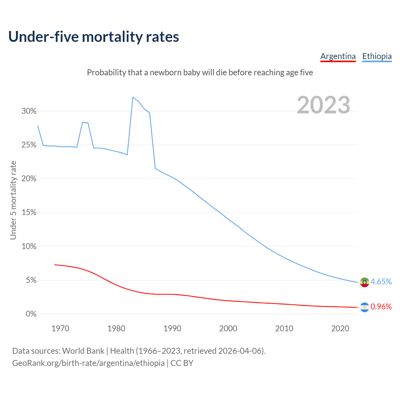 The chance that a newborn baby will die before reaching age five is 0.96% in Argentina and 4.65% in Ethiopia. Above is a chart with historical data on under-five mortality rates.