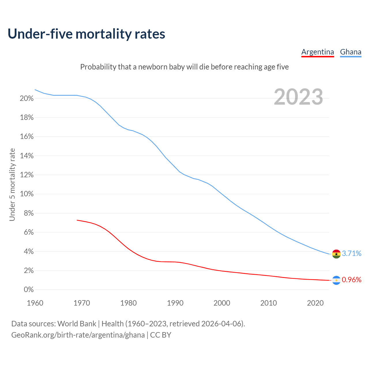 The chance that a newborn baby will die before reaching age five is 0.96% in Argentina and 3.71% in Ghana. Above is a chart with historical data on under-five mortality rates.