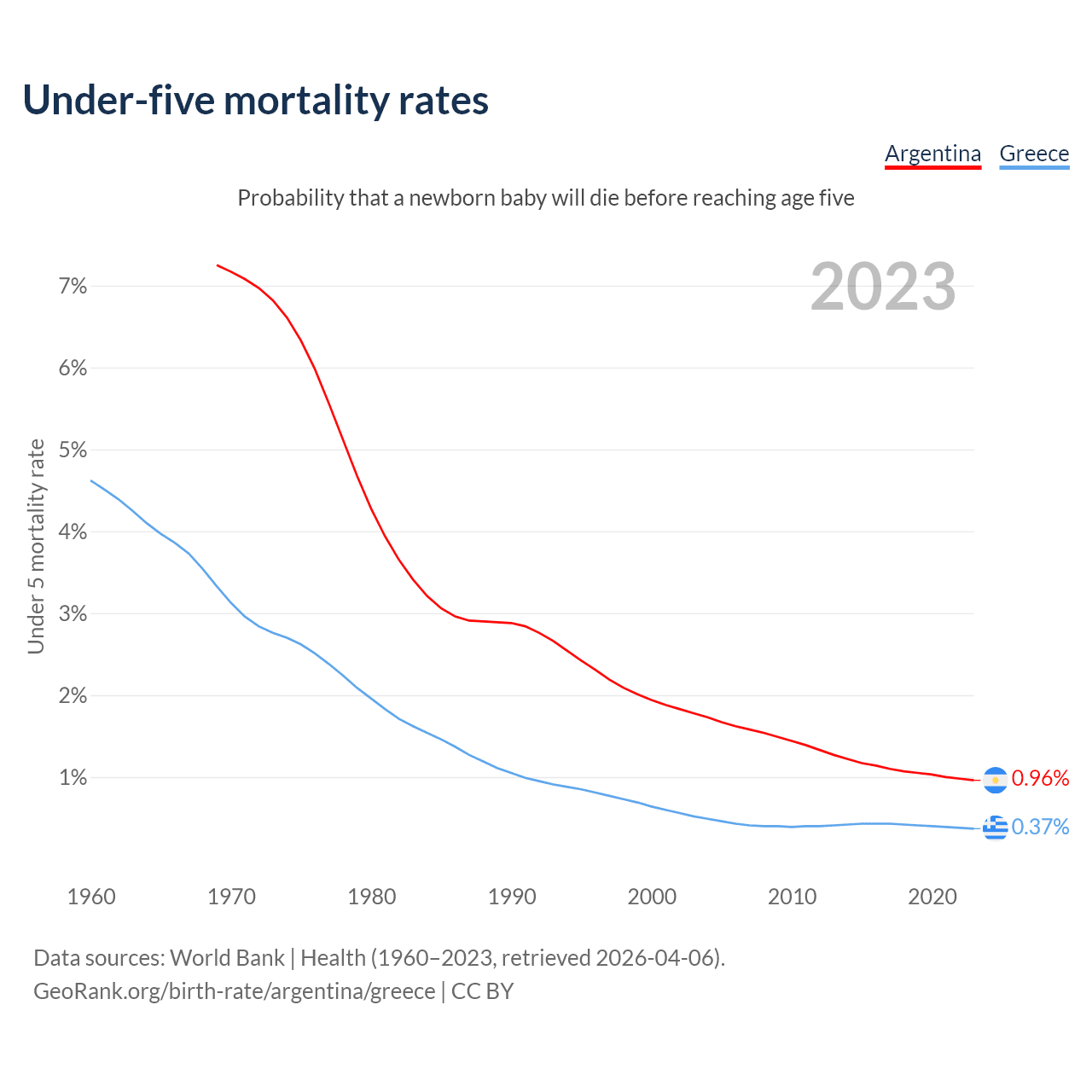 The chance that a newborn baby will die before reaching age five is 0.96% in Argentina and 0.37% in Greece. Above is a chart with historical data on under-five mortality rates.