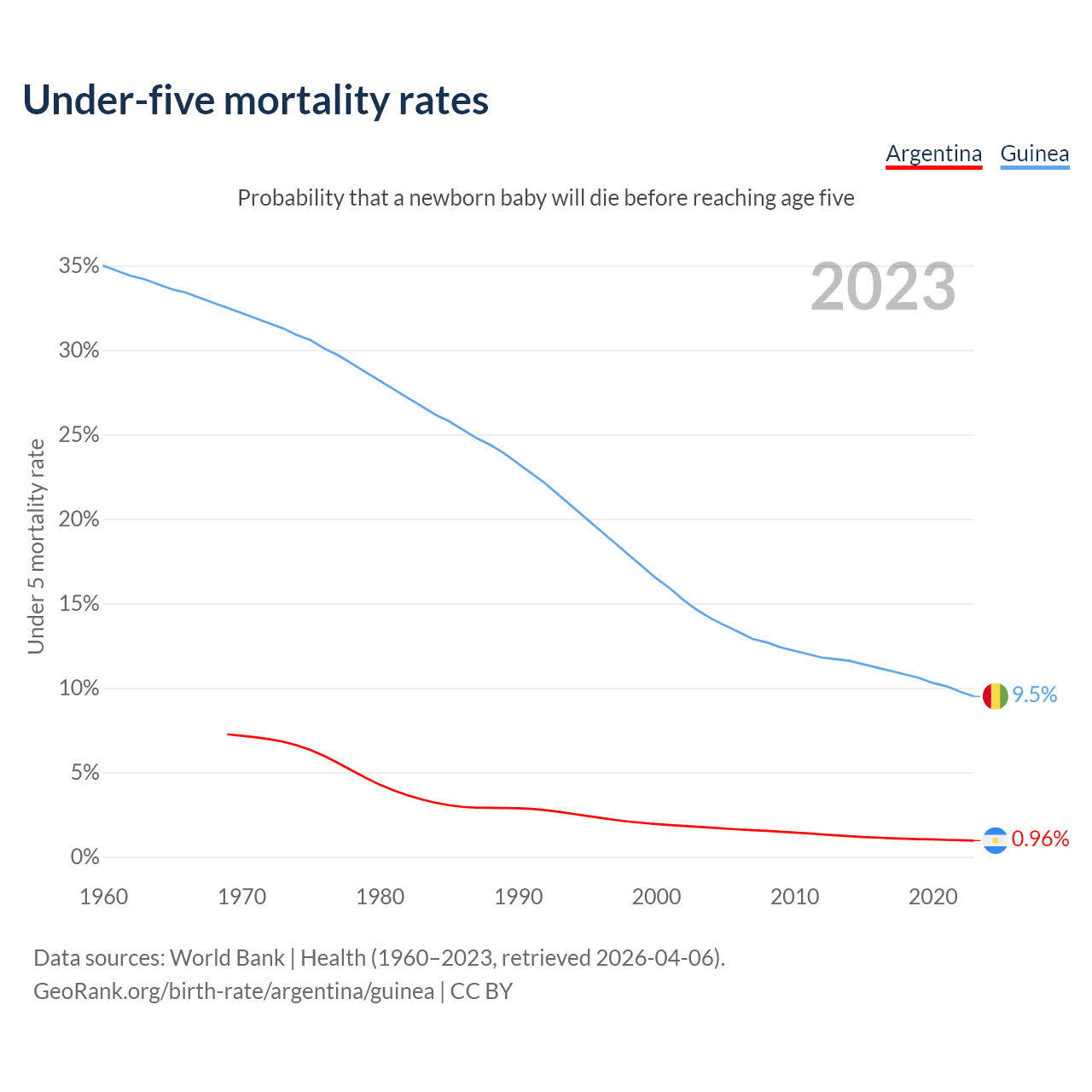 The chance that a newborn baby will die before reaching age five is 0.96% in Argentina and 9.5% in Guinea. Above is a chart with historical data on under-five mortality rates.