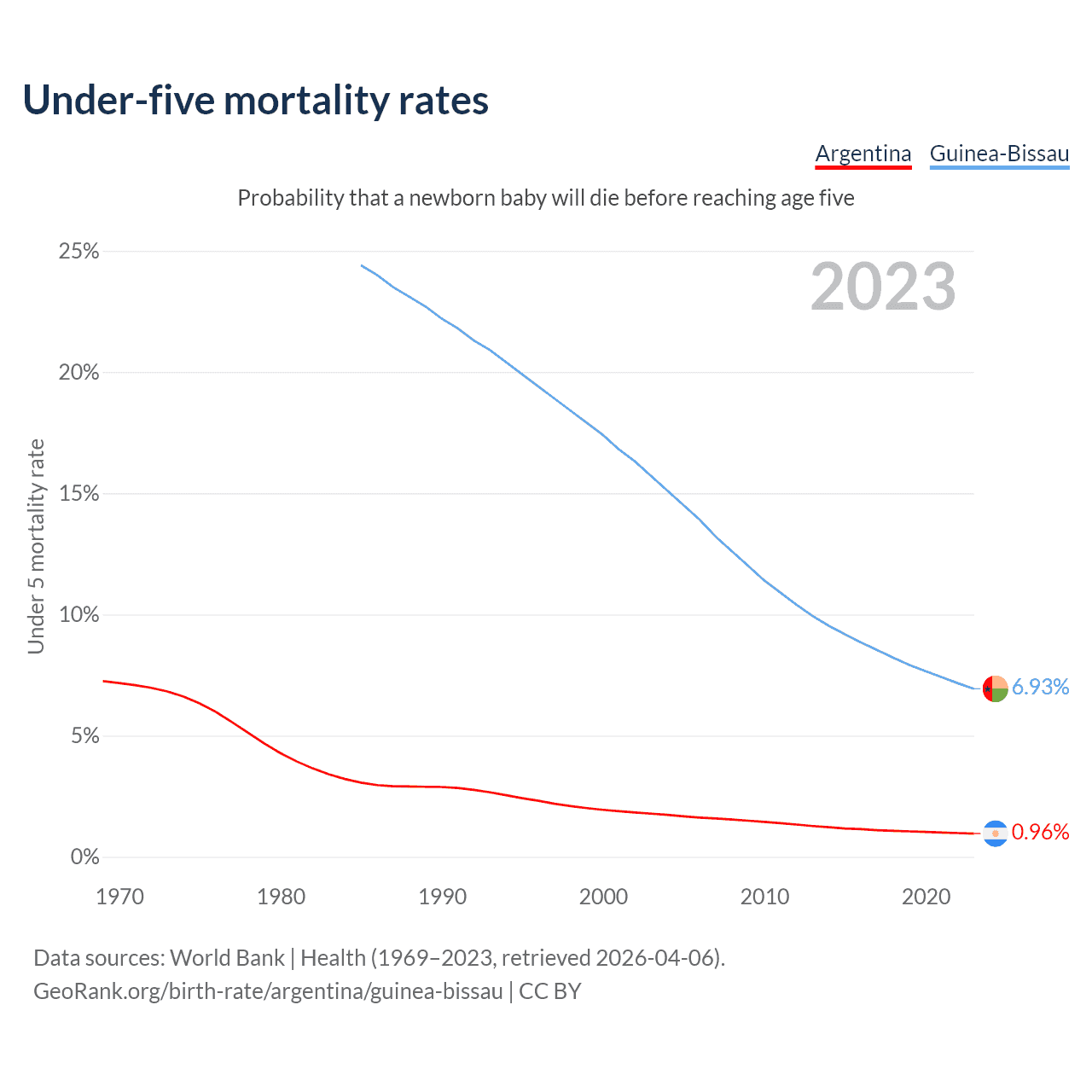 The chance that a newborn baby will die before reaching age five is 0.96% in Argentina and 6.93% in Guinea-Bissau. Above is a chart with historical data on under-five mortality rates.