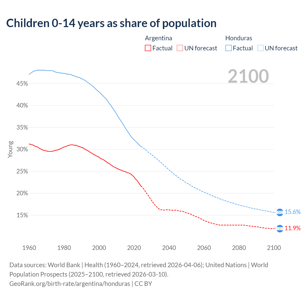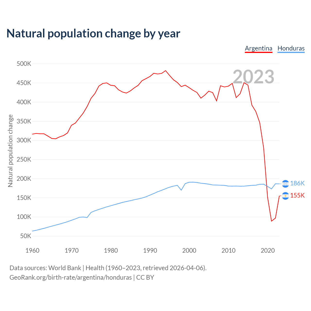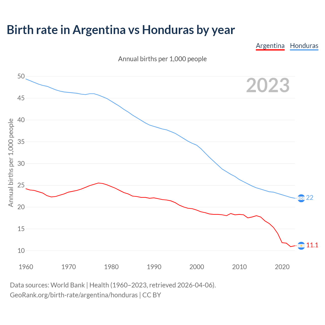 According to the latest available data on birth rates, the fertility rate in Argentina was 1.5 children per woman in 2023, compared to 2.5 in Honduras in 2023. The replacement level is considered to be 2.1 children per woman.