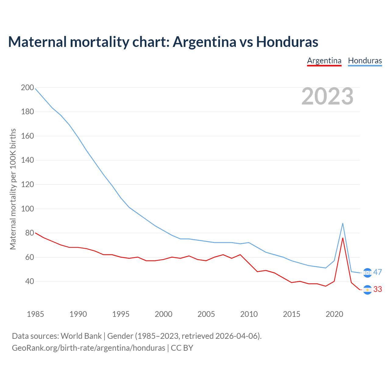 The maternal mortality rate, which is the probability of dying during childbirth or within 42 days of pregnancy termination, is 33 deaths per 100,000 live births in Argentina, compared to 47 deaths in Honduras.