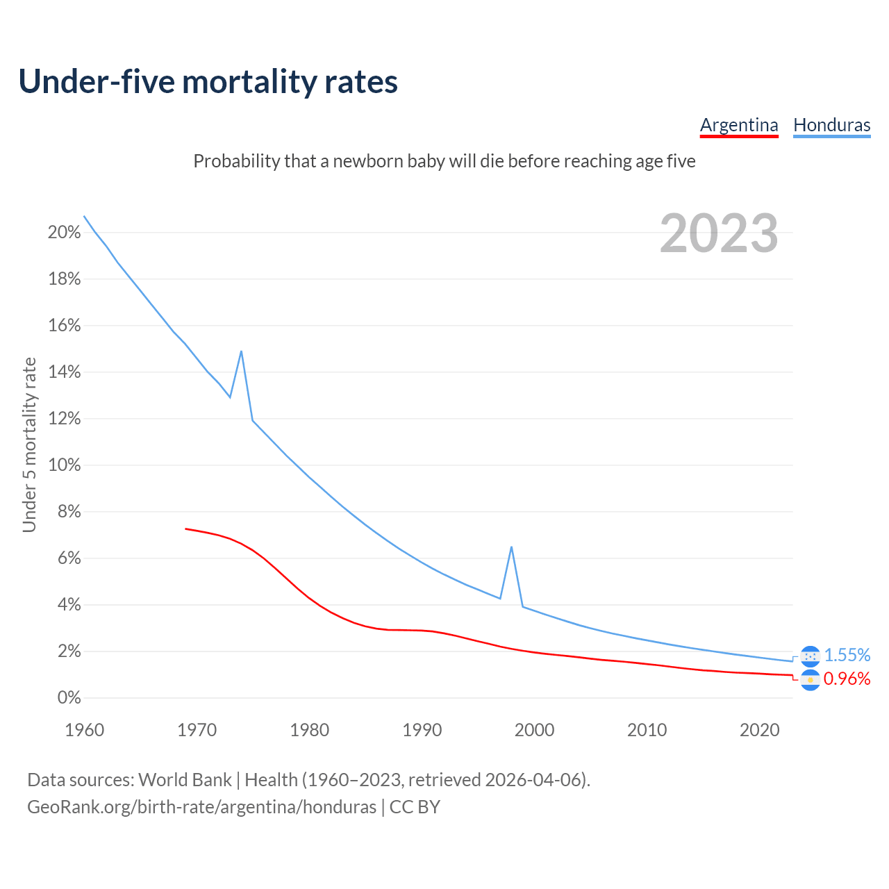 The chance that a newborn baby will die before reaching age five is 0.96% in Argentina and 1.55% in Honduras. Above is a chart with historical data on under-five mortality rates.