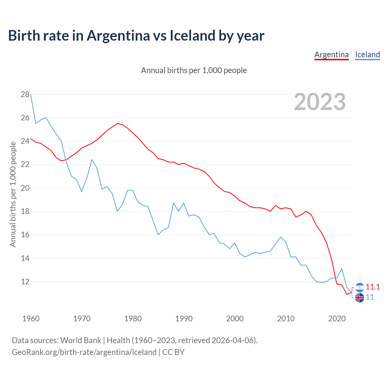 According to the latest available data on birth rates, the fertility rate in Argentina was 1.5 children per woman in 2023, compared to 1.59 in Iceland in 2023. The replacement level is considered to be 2.1 children per woman.