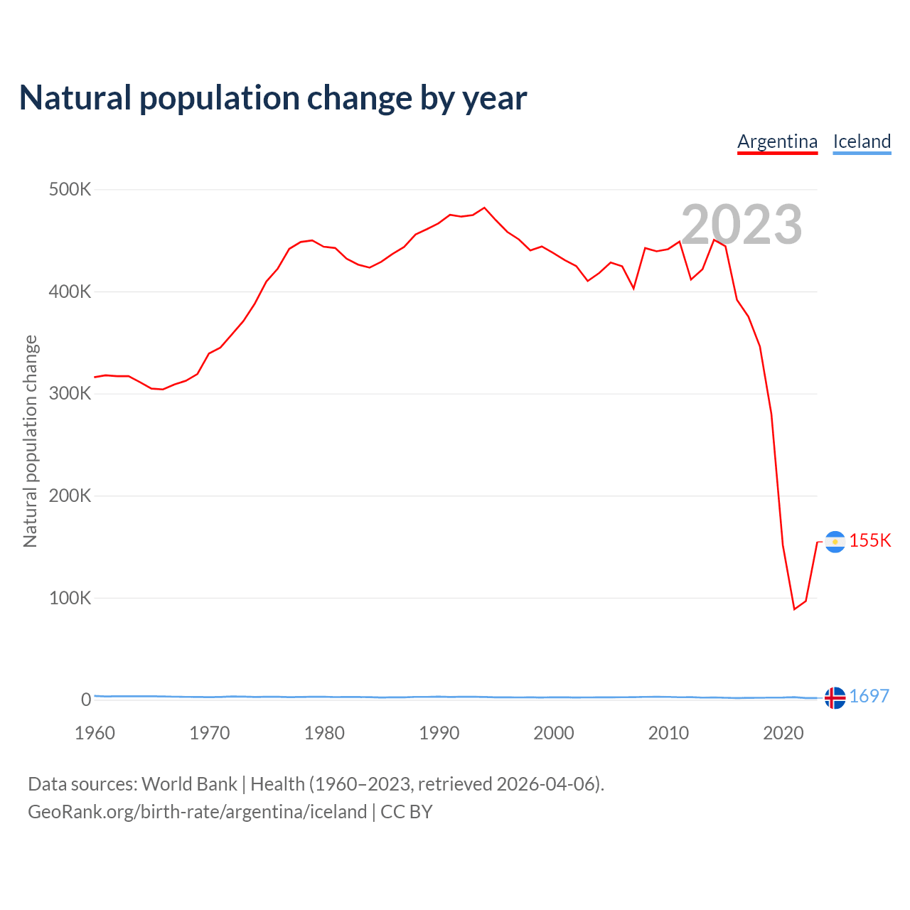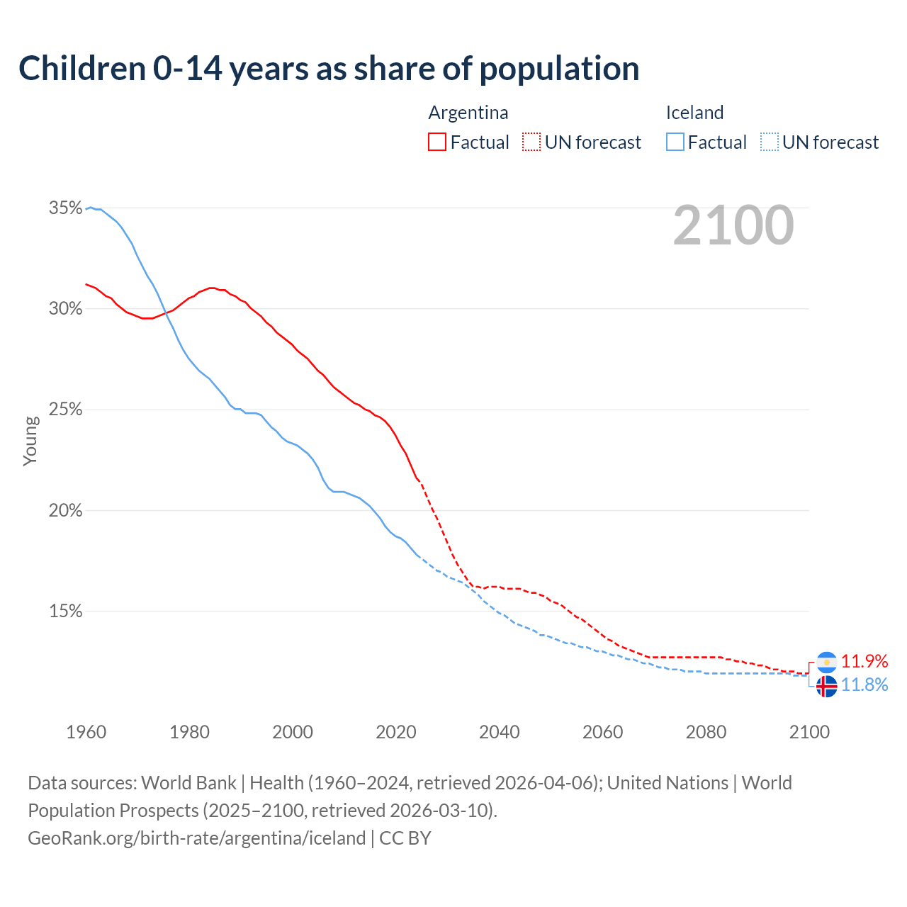 Argentina has an annual birth rate of 11.1 births per 1,000 people, compared to 11 for Iceland. The average number of children a woman is expected to have during her lifetime — the fertility rate, is 1.5 in Argentina and 1.59 in Iceland — 6% difference.