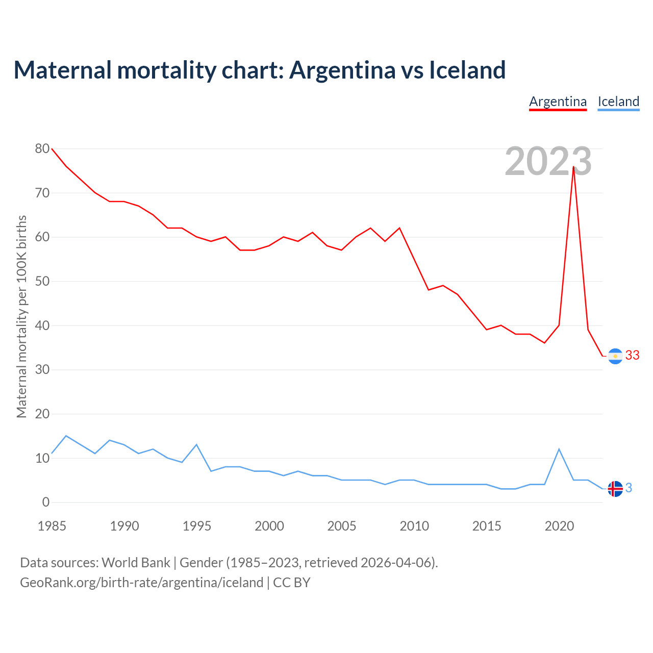 The maternal mortality rate, which is the probability of dying during childbirth or within 42 days of pregnancy termination, is 33 deaths per 100,000 live births in Argentina, compared to 3 deaths in Iceland.