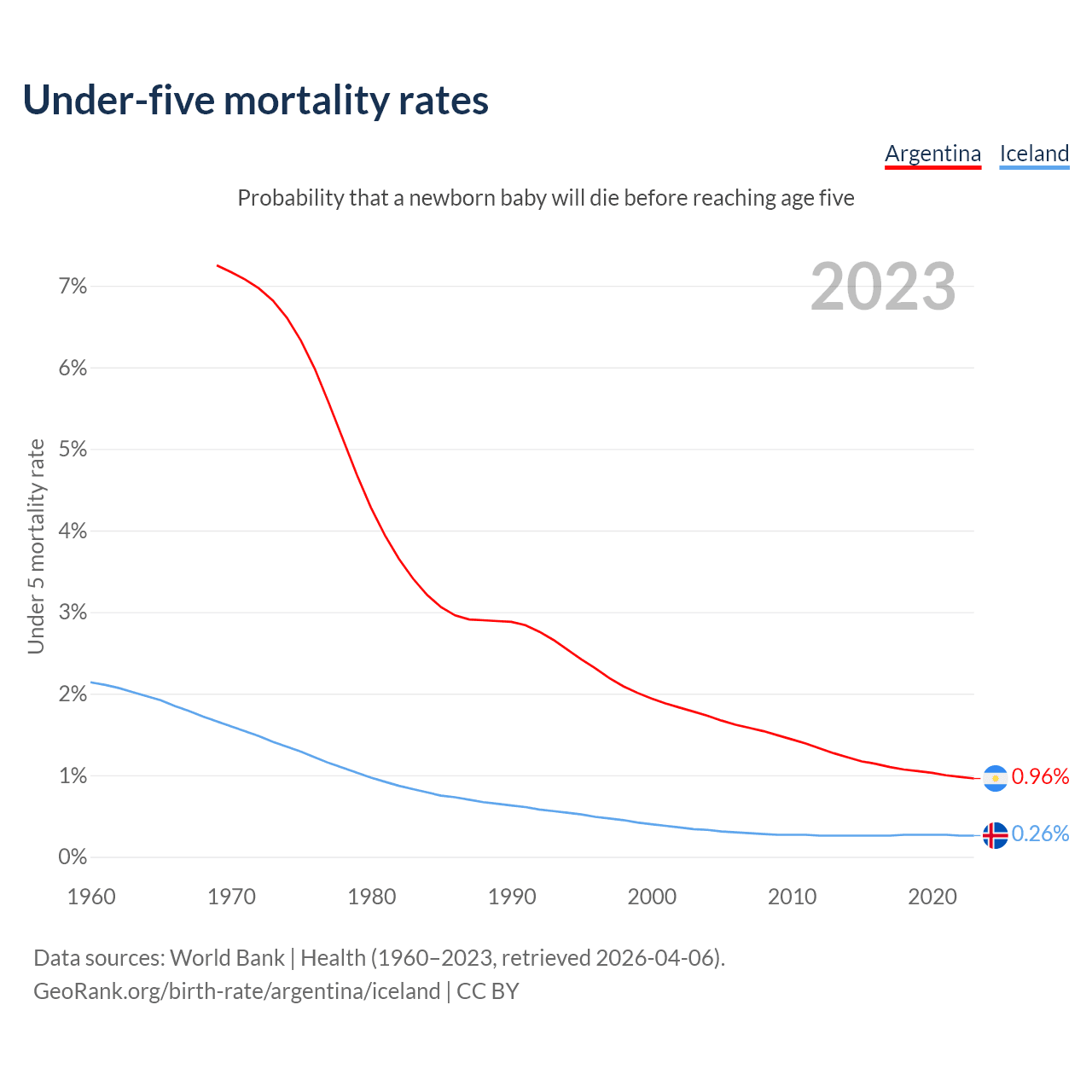 The chance that a newborn baby will die before reaching age five is 0.96% in Argentina and 0.26% in Iceland. Above is a chart with historical data on under-five mortality rates.