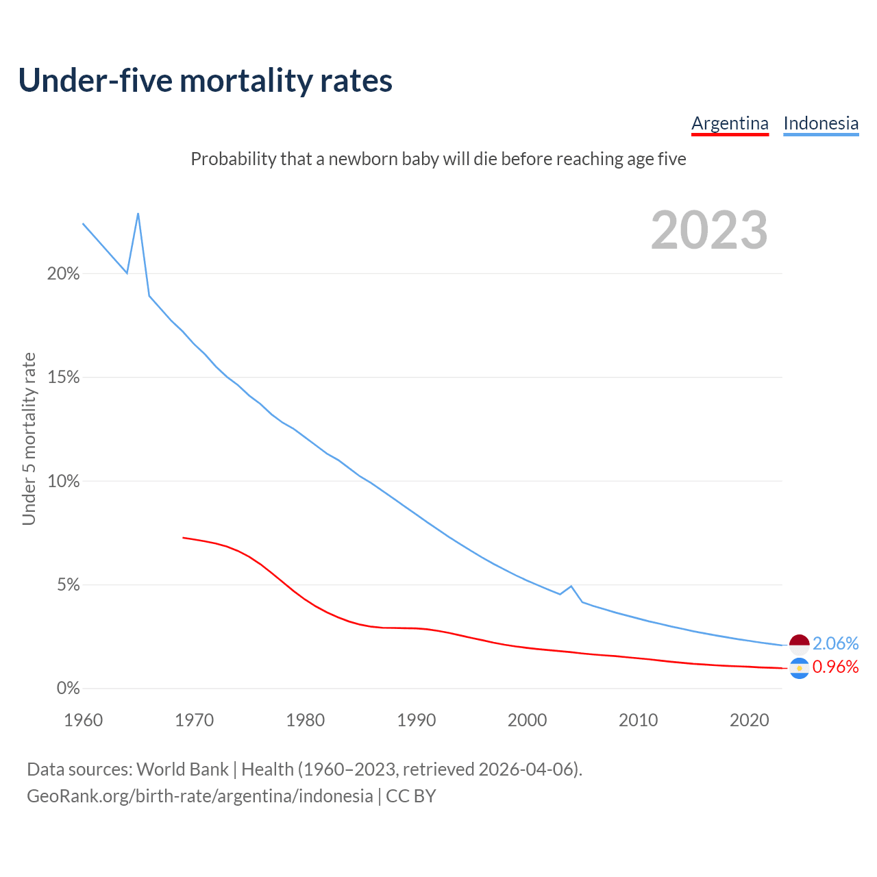 The chance that a newborn baby will die before reaching age five is 0.96% in Argentina and 2.06% in Indonesia. Above is a chart with historical data on under-five mortality rates.
