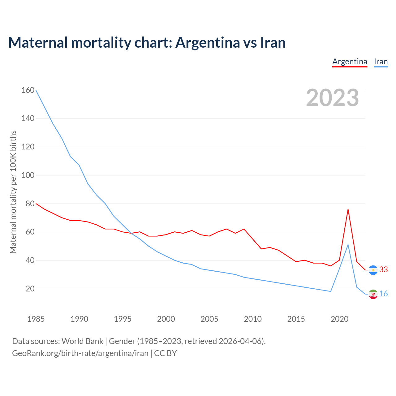 The maternal mortality rate, which is the probability of dying during childbirth or within 42 days of pregnancy termination, is 33 deaths per 100,000 live births in Argentina, compared to 16 deaths in Iran.