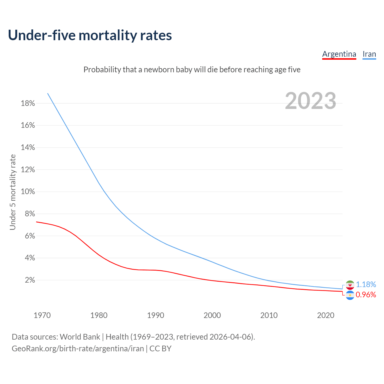 The chance that a newborn baby will die before reaching age five is 0.96% in Argentina and 1.18% in Iran. Above is a chart with historical data on under-five mortality rates.
