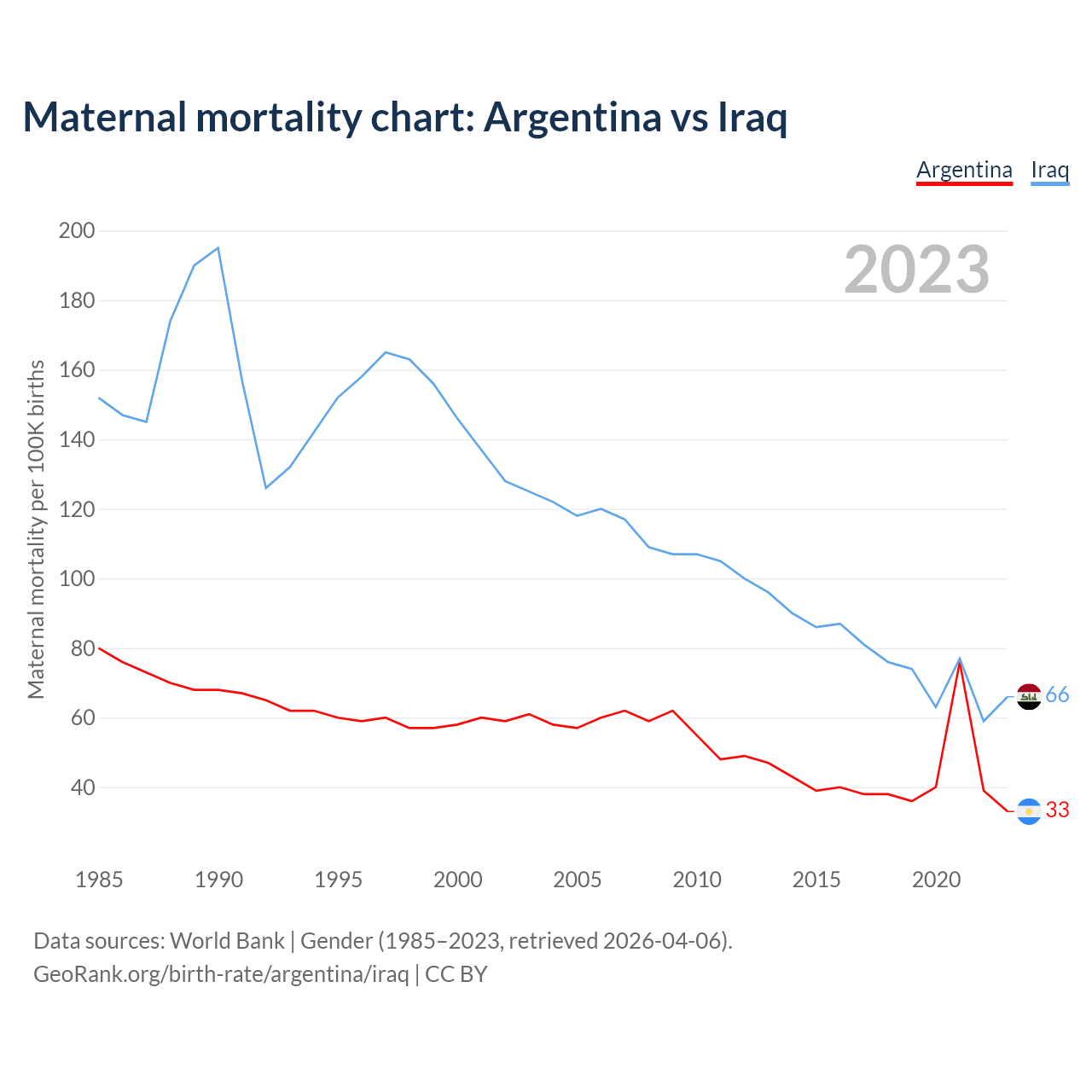 The maternal mortality rate, which is the probability of dying during childbirth or within 42 days of pregnancy termination, is 33 deaths per 100,000 live births in Argentina, compared to 66 deaths in Iraq.