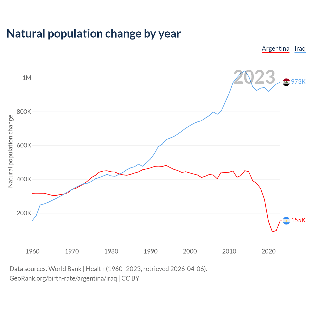 According to the latest available data on birth rates, the fertility rate in Argentina was 1.5 children per woman in 2023, compared to 3.25 in Iraq in 2023. The replacement level is considered to be 2.1 children per woman.
