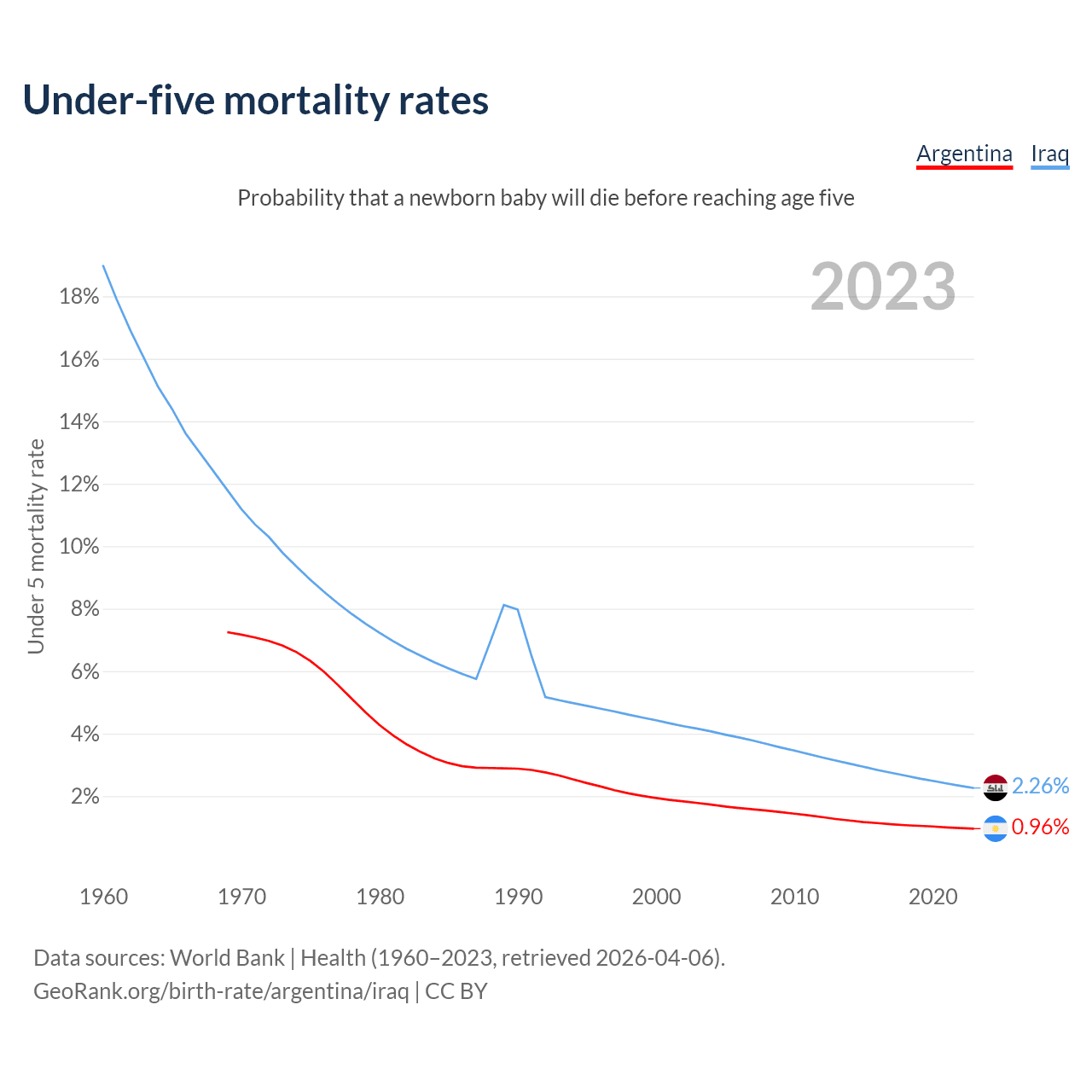 The chance that a newborn baby will die before reaching age five is 0.96% in Argentina and 2.26% in Iraq. Above is a chart with historical data on under-five mortality rates.