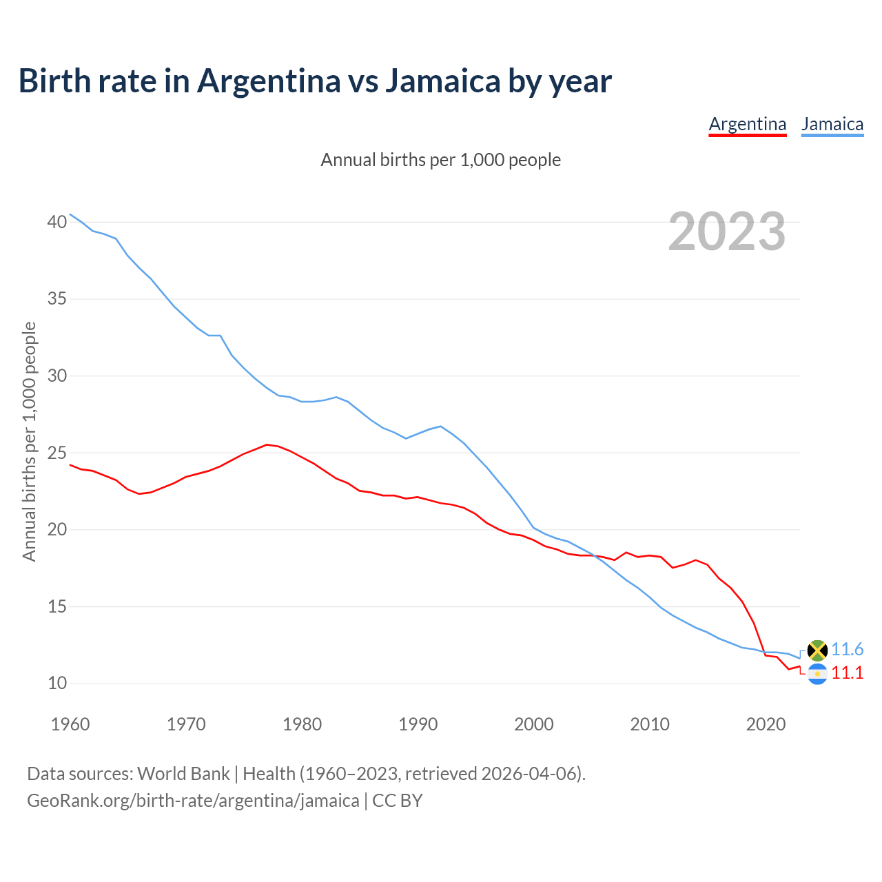 Argentina has an annual birth rate of 11.1 births per 1,000 people, compared to 11.6 for Jamaica. The average number of children a woman is expected to have during her lifetime — the fertility rate, is 1.5 in Argentina and 1.36 in Jamaica — 9.47% difference.