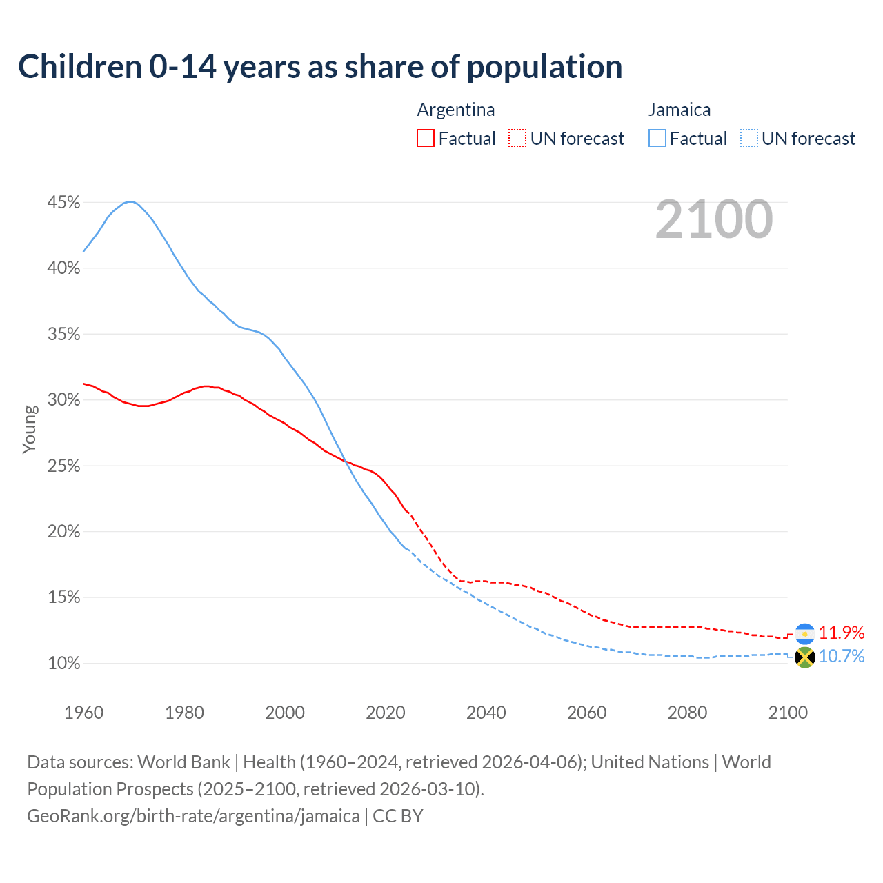According to the latest available data on birth rates, the fertility rate in Argentina was 1.5 children per woman in 2023, compared to 1.36 in Jamaica in 2023. The replacement level is considered to be 2.1 children per woman.