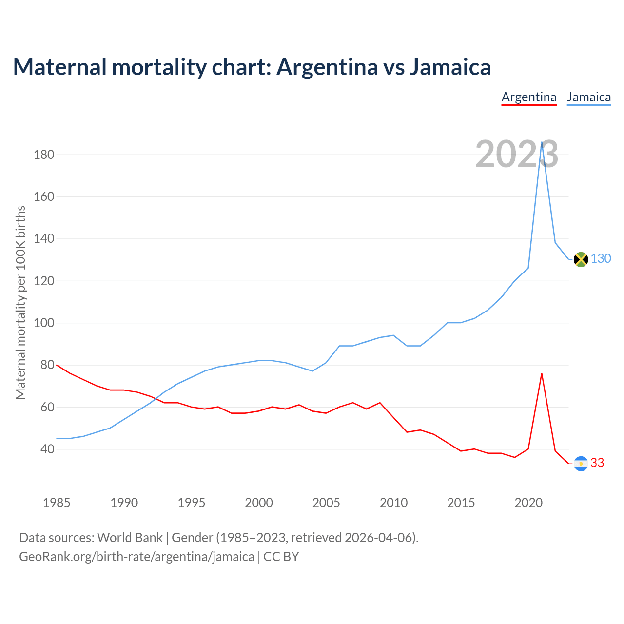 The maternal mortality rate, which is the probability of dying during childbirth or within 42 days of pregnancy termination, is 33 deaths per 100,000 live births in Argentina, compared to 130 deaths in Jamaica.