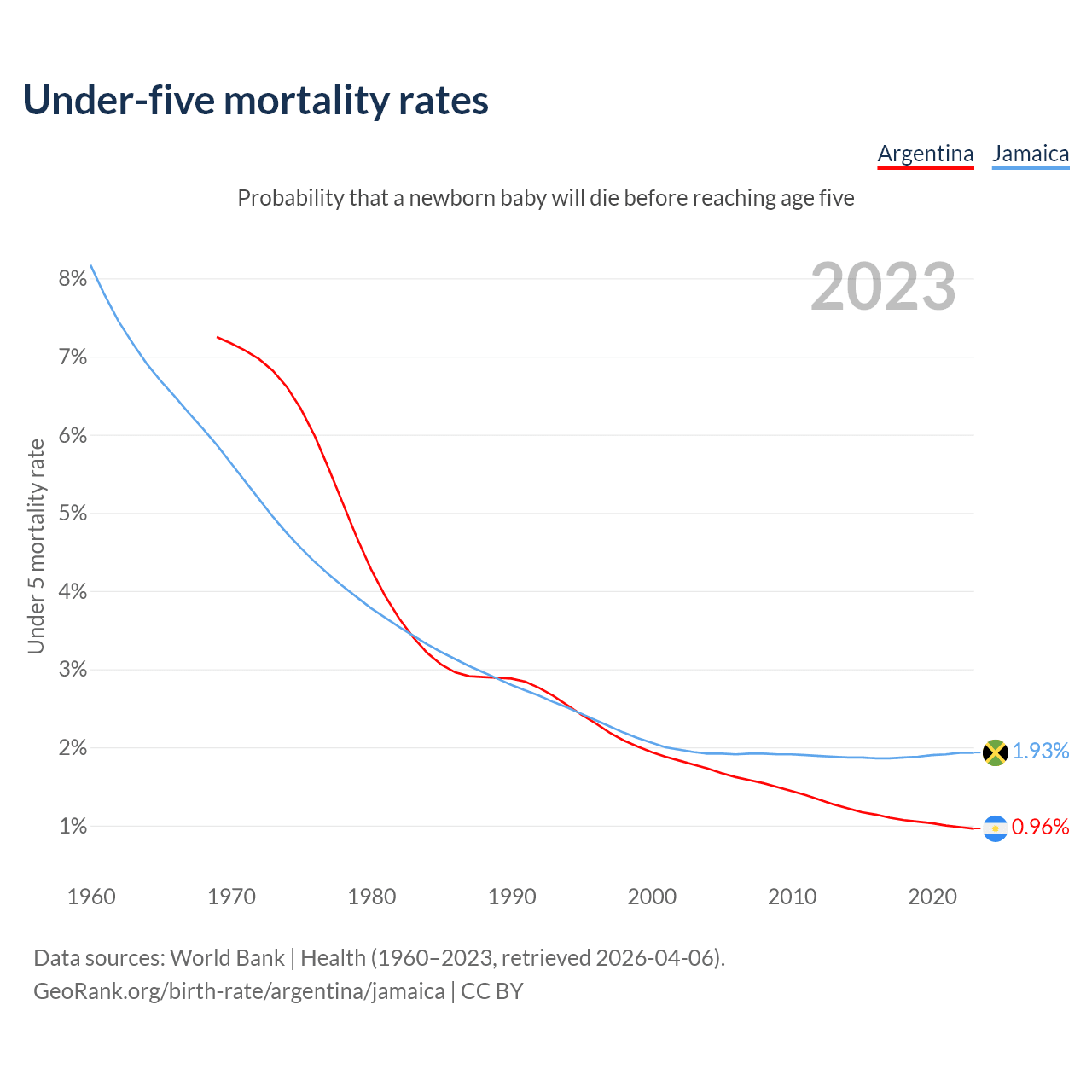 The chance that a newborn baby will die before reaching age five is 0.96% in Argentina and 1.93% in Jamaica. Above is a chart with historical data on under-five mortality rates.