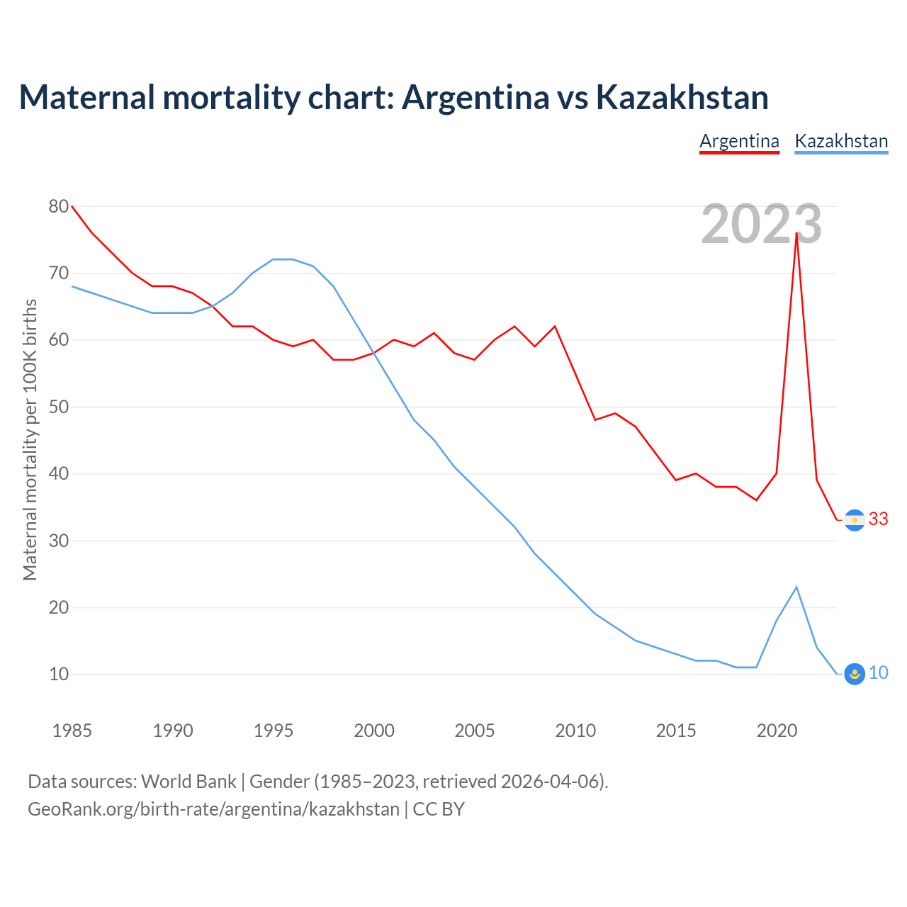 The maternal mortality rate, which is the probability of dying during childbirth or within 42 days of pregnancy termination, is 33 deaths per 100,000 live births in Argentina, compared to 10 deaths in Kazakhstan.
