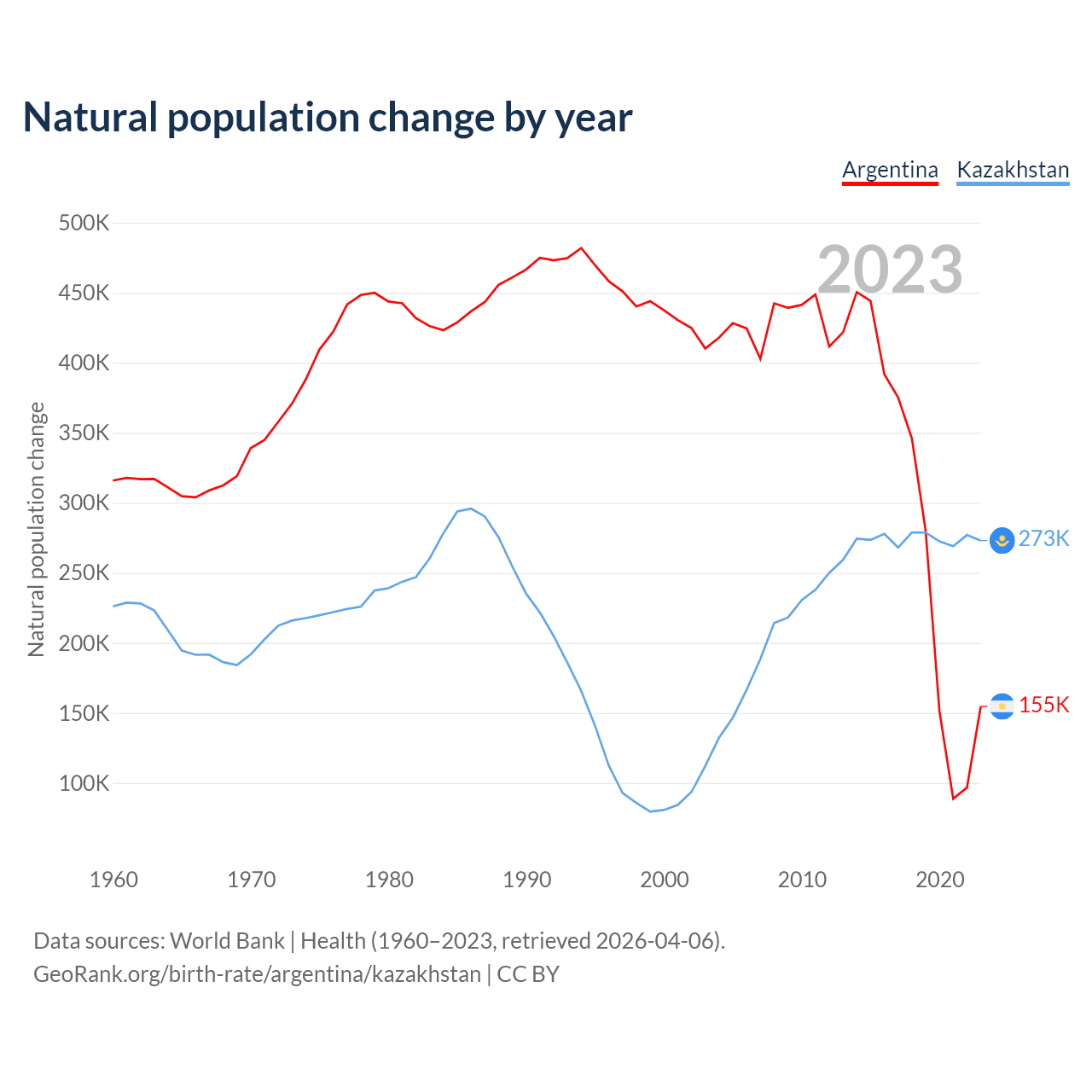 According to the latest available data on birth rates, the fertility rate in Argentina was 1.5 children per woman in 2023, compared to 3.01 in Kazakhstan in 2023. The replacement level is considered to be 2.1 children per woman.