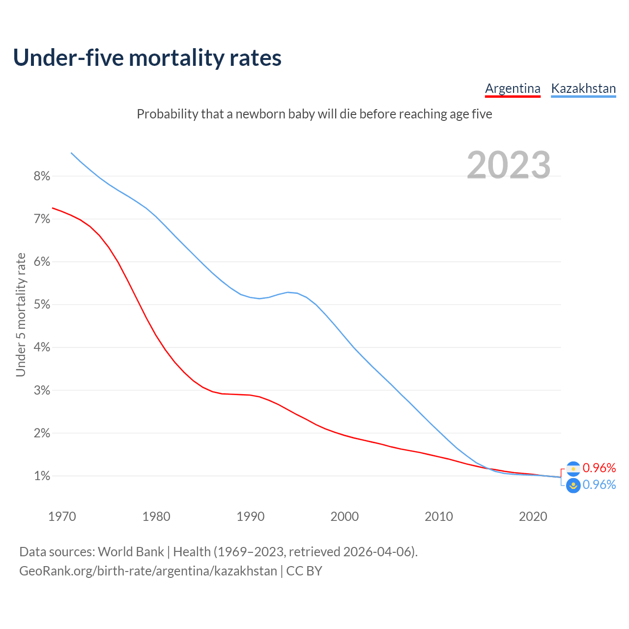 The chance that a newborn baby will die before reaching age five is 0.96% in Argentina and 0.96% in Kazakhstan. Above is a chart with historical data on under-five mortality rates.