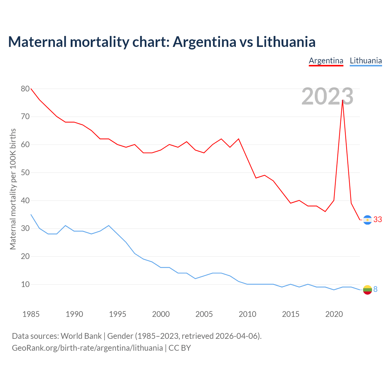 The maternal mortality rate, which is the probability of dying during childbirth or within 42 days of pregnancy termination, is 33 deaths per 100,000 live births in Argentina, compared to 8 deaths in Lithuania.