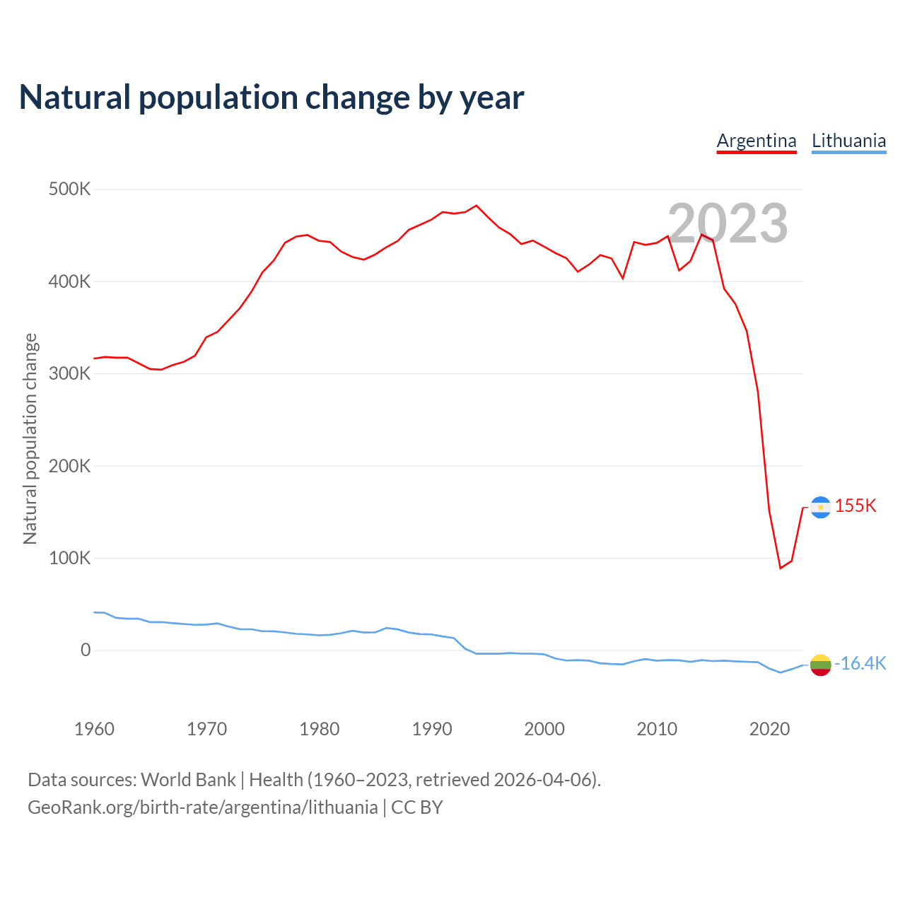 According to the latest available data on birth rates, the fertility rate in Argentina was 1.5 children per woman in 2023, compared to 1.18 in Lithuania in 2023. The replacement level is considered to be 2.1 children per woman.