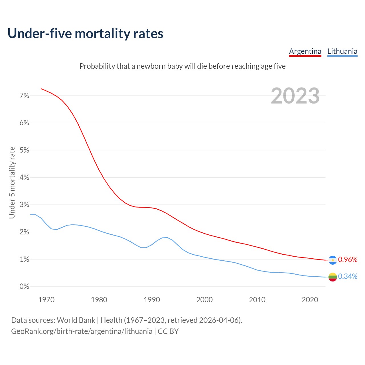 The chance that a newborn baby will die before reaching age five is 0.96% in Argentina and 0.34% in Lithuania. Above is a chart with historical data on under-five mortality rates.