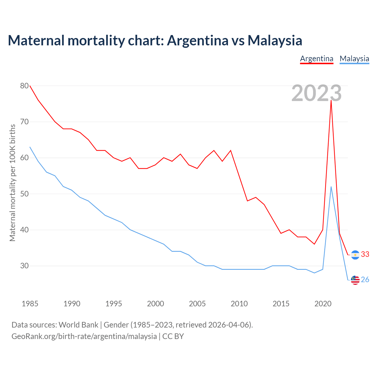 The maternal mortality rate, which is the probability of dying during childbirth or within 42 days of pregnancy termination, is 33 deaths per 100,000 live births in Argentina, compared to 26 deaths in Malaysia.