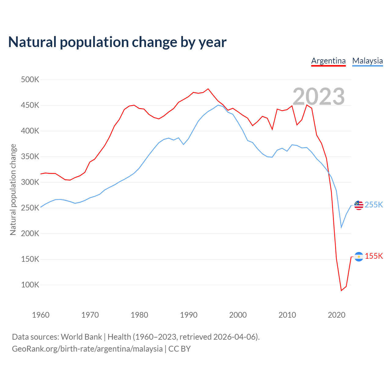 Argentina has an annual birth rate of 11.1 births per 1,000 people, compared to 12.4 for Malaysia. The average number of children a woman is expected to have during her lifetime — the fertility rate, is 1.5 in Argentina and 1.55 in Malaysia — 3.33% difference.