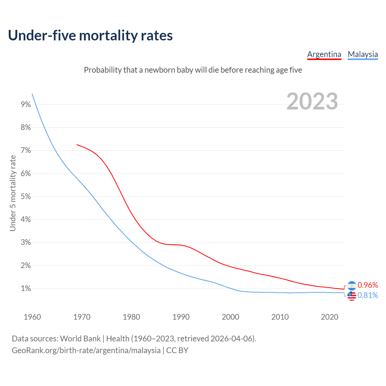 The chance that a newborn baby will die before reaching age five is 0.96% in Argentina and 0.81% in Malaysia. Above is a chart with historical data on under-five mortality rates.