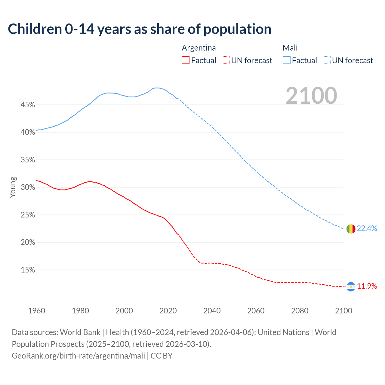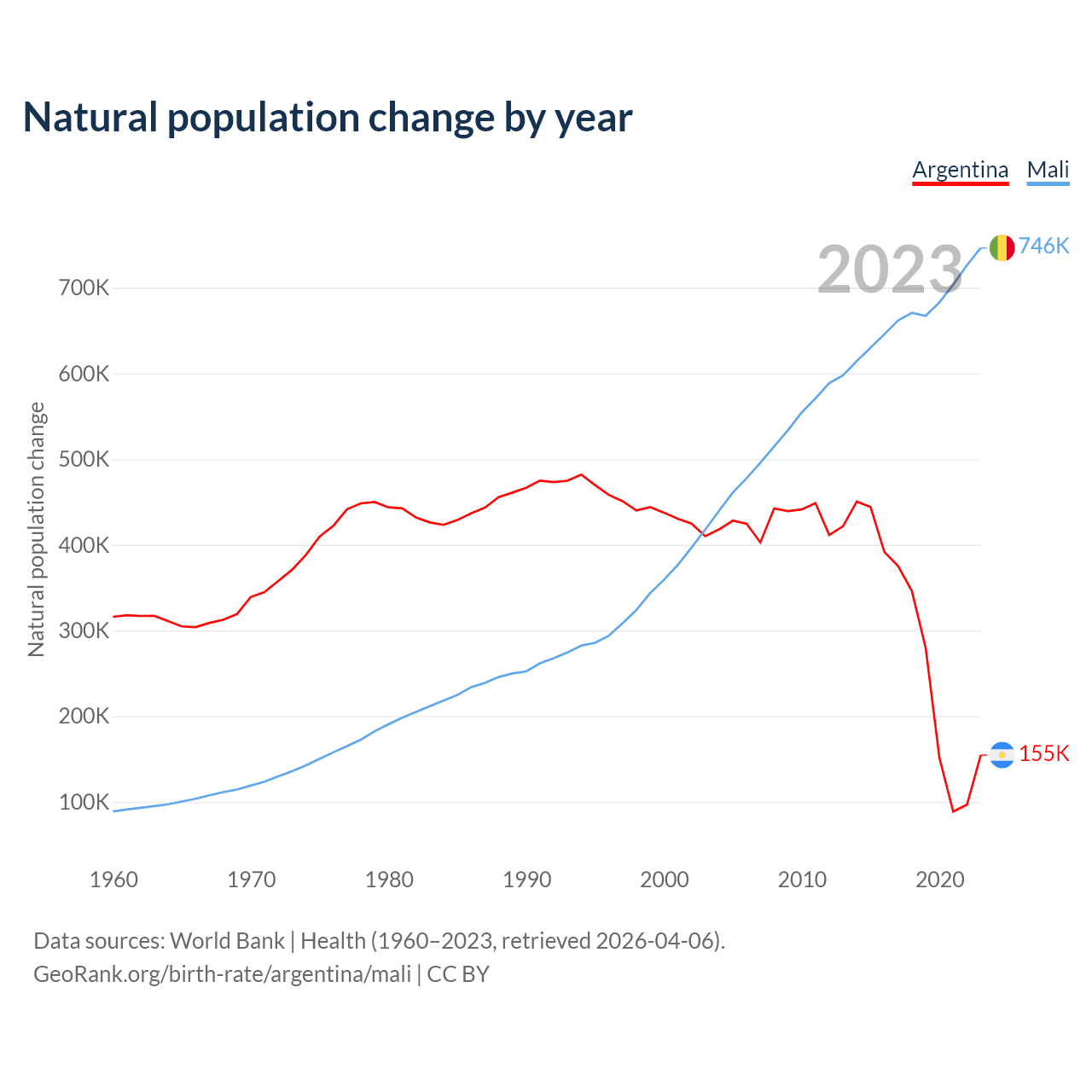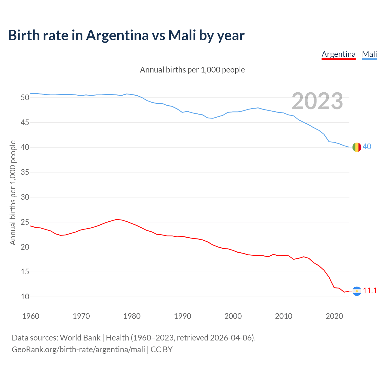According to the latest available data on birth rates, the fertility rate in Argentina was 1.5 children per woman in 2023, compared to 5.61 in Mali in 2023. The replacement level is considered to be 2.1 children per woman.