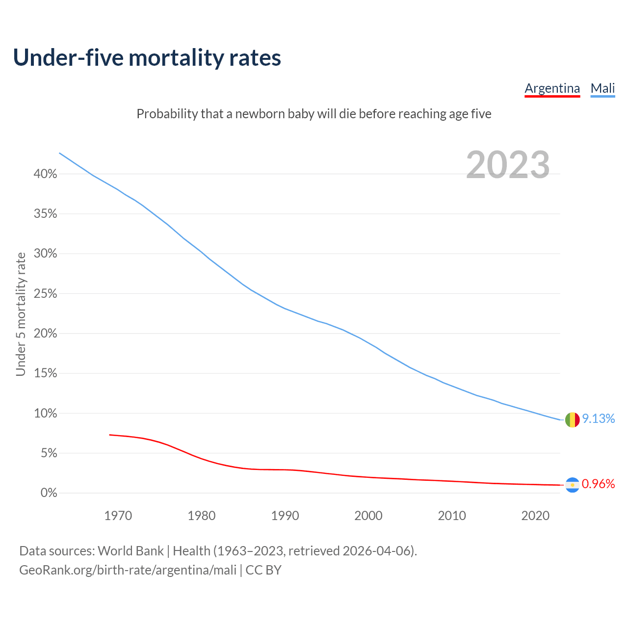 The chance that a newborn baby will die before reaching age five is 0.96% in Argentina and 9.13% in Mali. Above is a chart with historical data on under-five mortality rates.