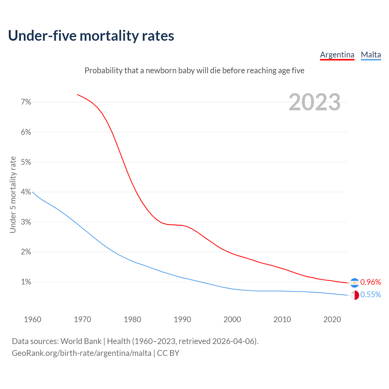 The chance that a newborn baby will die before reaching age five is 0.96% in Argentina and 0.55% in Malta. Above is a chart with historical data on under-five mortality rates.