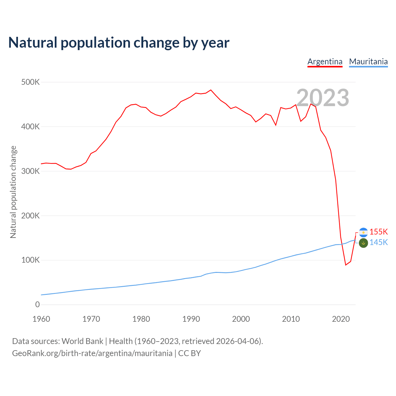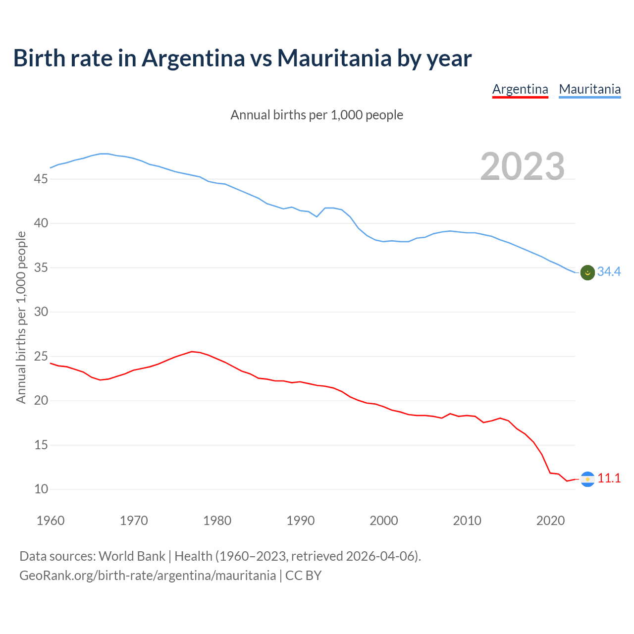 Argentina has an annual birth rate of 11.1 births per 1,000 people, compared to 34.4 for Mauritania. The average number of children a woman is expected to have during her lifetime — the fertility rate, is 1.5 in Argentina and 4.7 in Mauritania — 213.1% difference.
