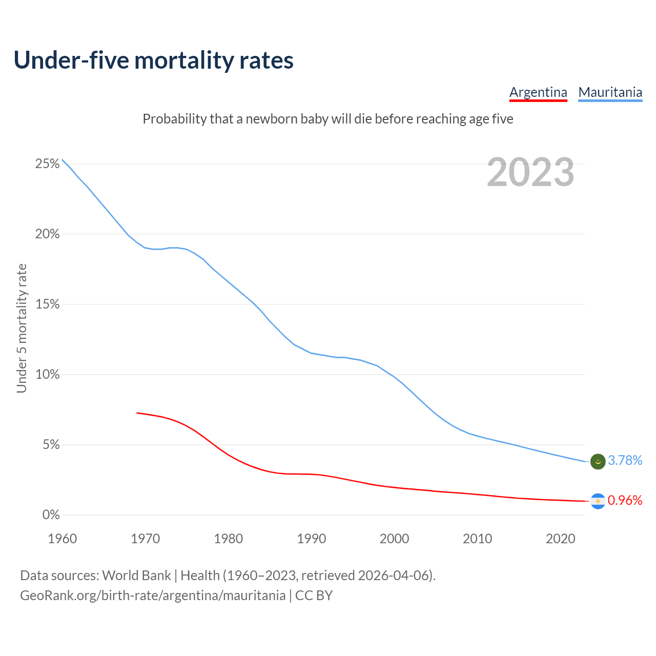 The chance that a newborn baby will die before reaching age five is 0.96% in Argentina and 3.78% in Mauritania. Above is a chart with historical data on under-five mortality rates.