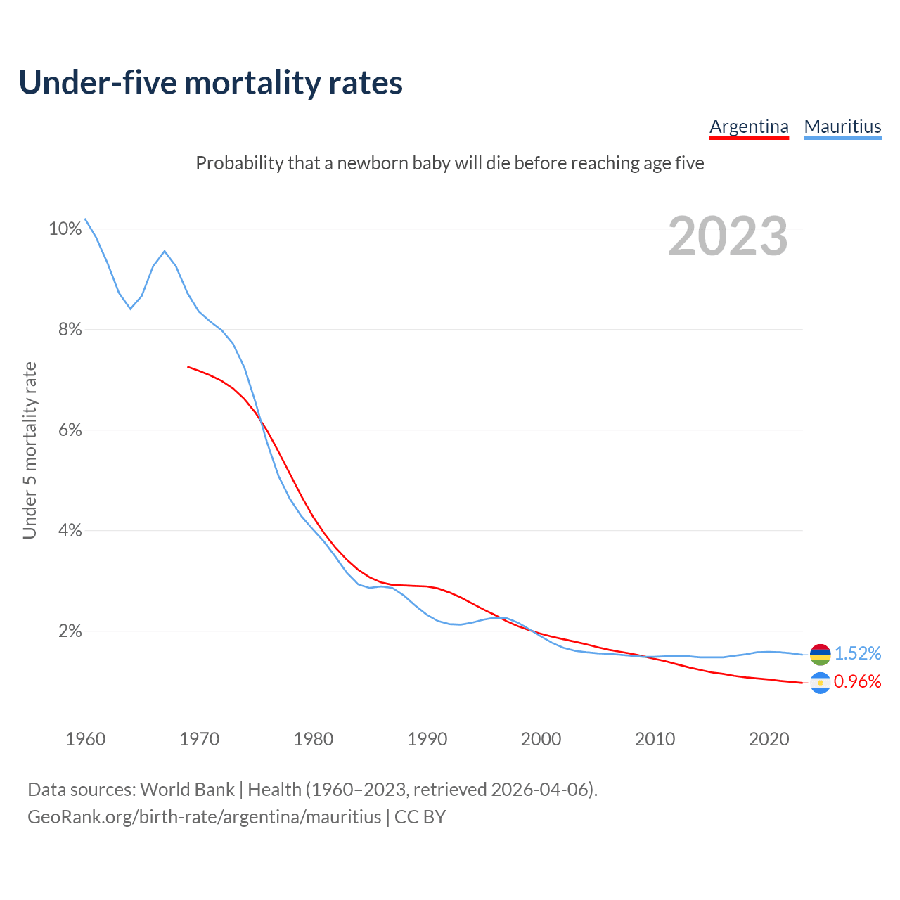The chance that a newborn baby will die before reaching age five is 0.96% in Argentina and 1.52% in Mauritius. Above is a chart with historical data on under-five mortality rates.