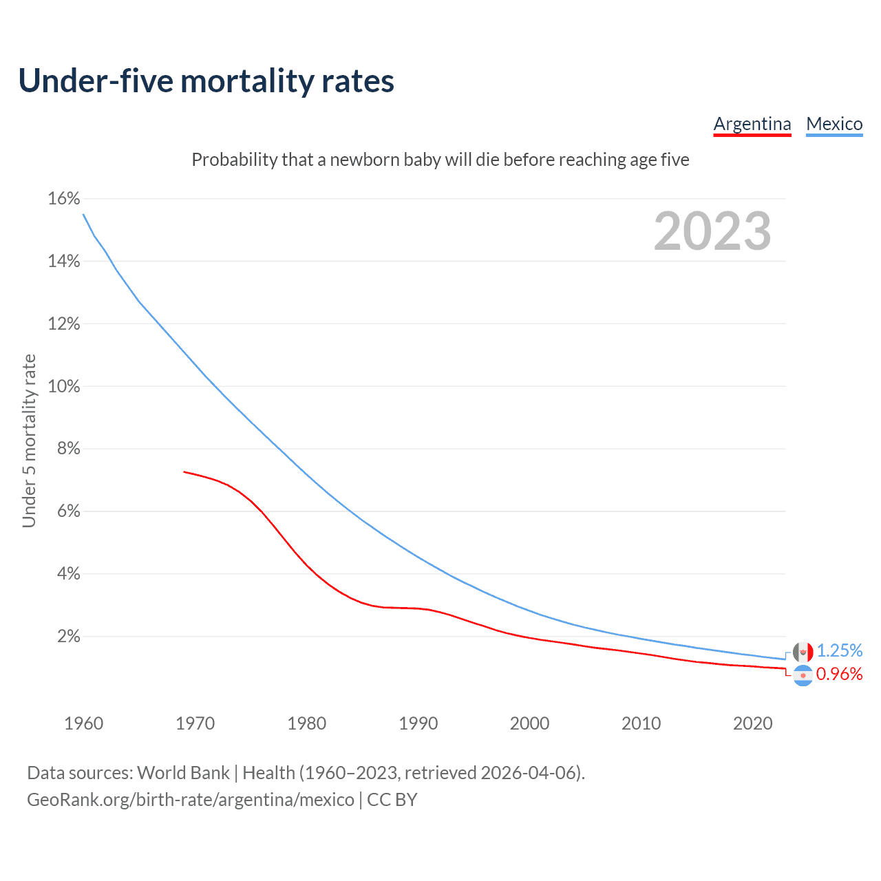The chance that a newborn baby will die before reaching age five is 0.96% in Argentina and 1.25% in Mexico. Above is a chart with historical data on under-five mortality rates.