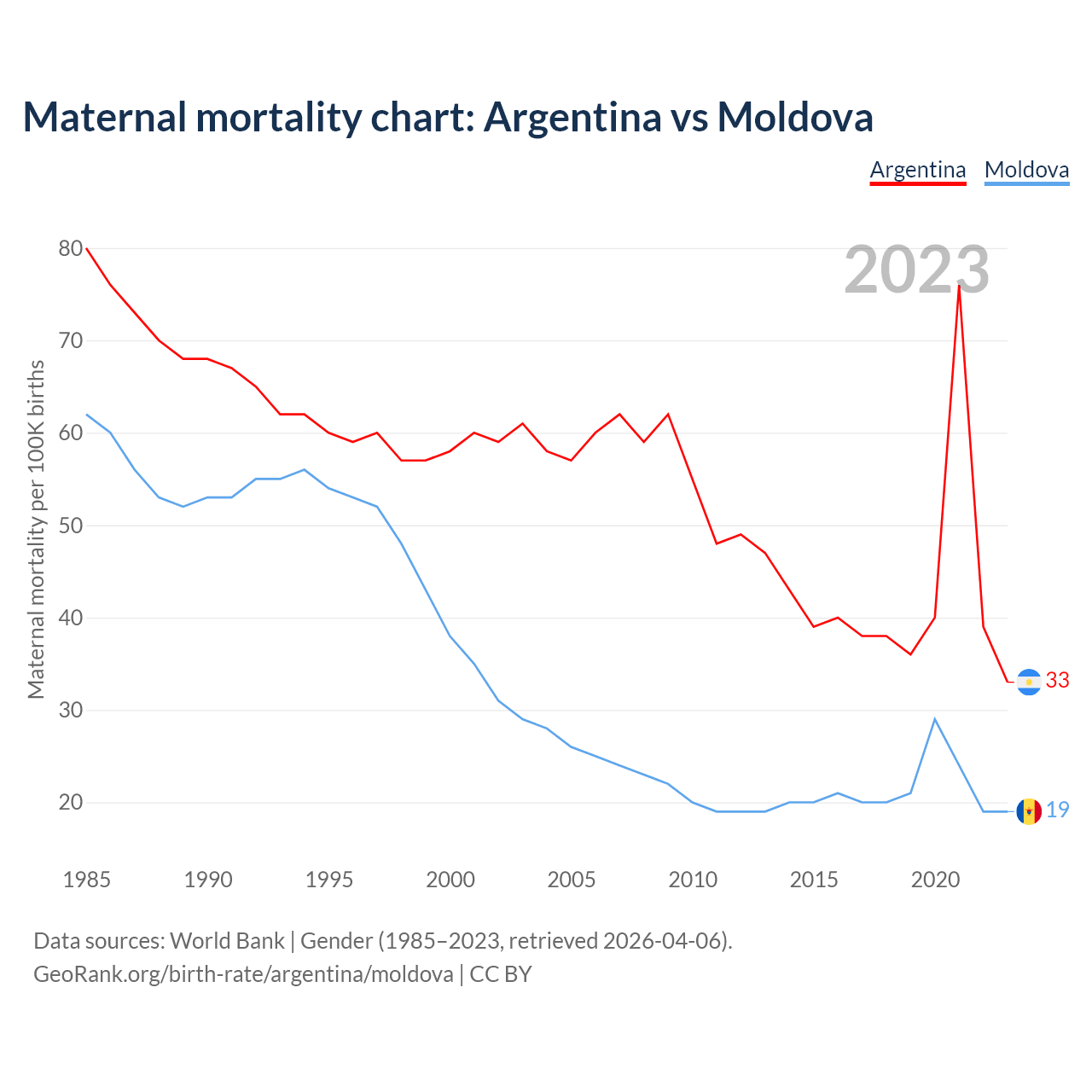 The maternal mortality rate, which is the probability of dying during childbirth or within 42 days of pregnancy termination, is 33 deaths per 100,000 live births in Argentina, compared to 19 deaths in Moldova.