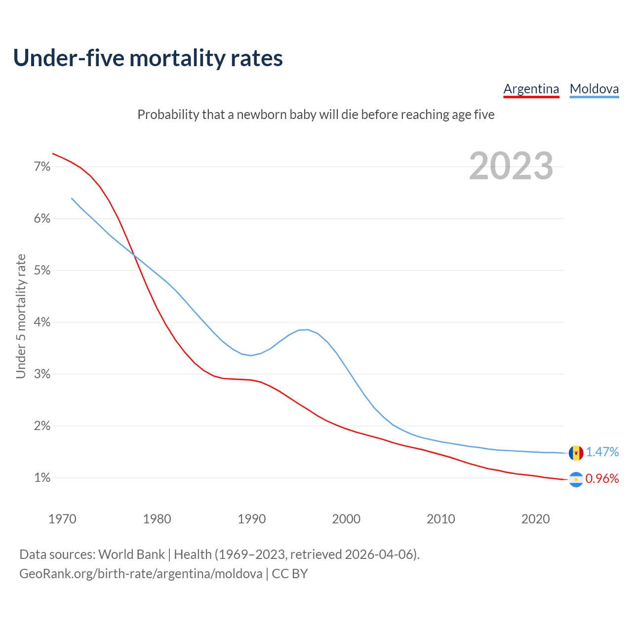 The chance that a newborn baby will die before reaching age five is 0.96% in Argentina and 1.47% in Moldova. Above is a chart with historical data on under-five mortality rates.