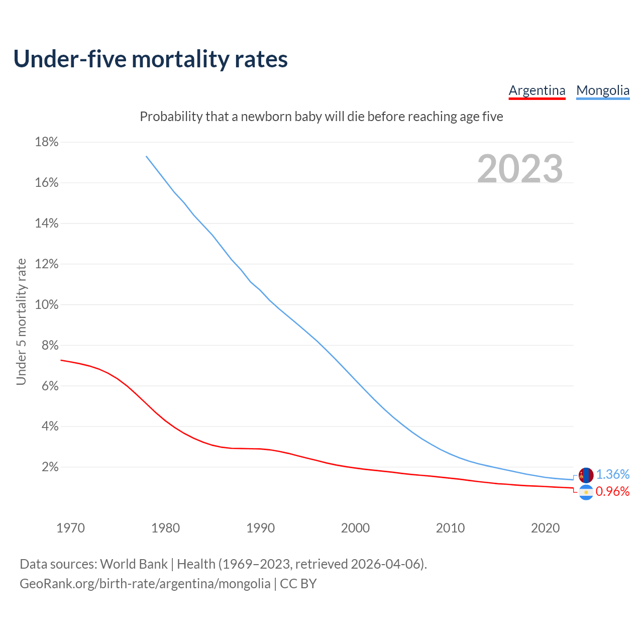The chance that a newborn baby will die before reaching age five is 0.96% in Argentina and 1.36% in Mongolia. Above is a chart with historical data on under-five mortality rates.