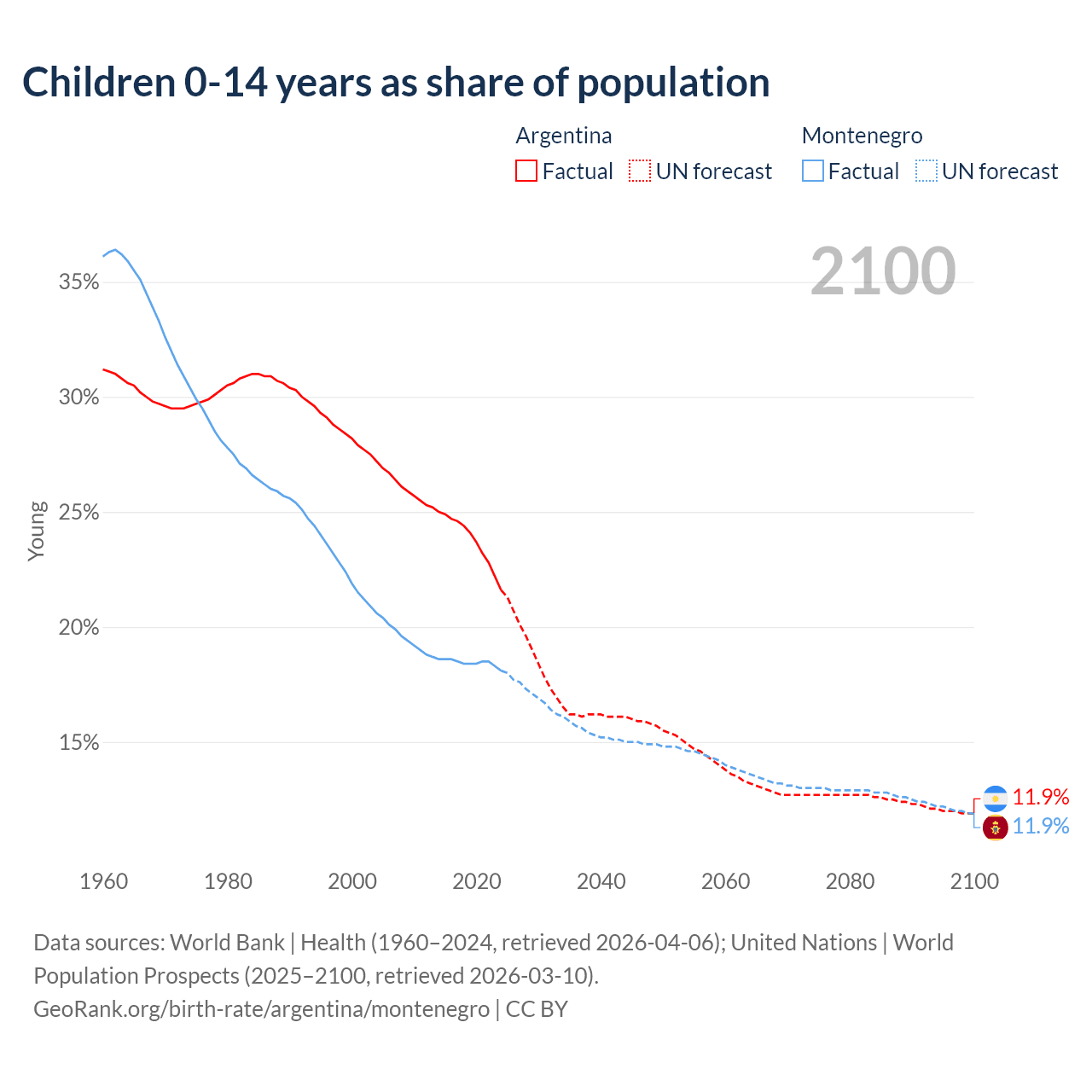 Argentina has an annual birth rate of 11.1 births per 1,000 people, compared to 11.2 for Montenegro. The average number of children a woman is expected to have during her lifetime — the fertility rate, is 1.5 in Argentina and 1.74 in Montenegro — 16% difference.
