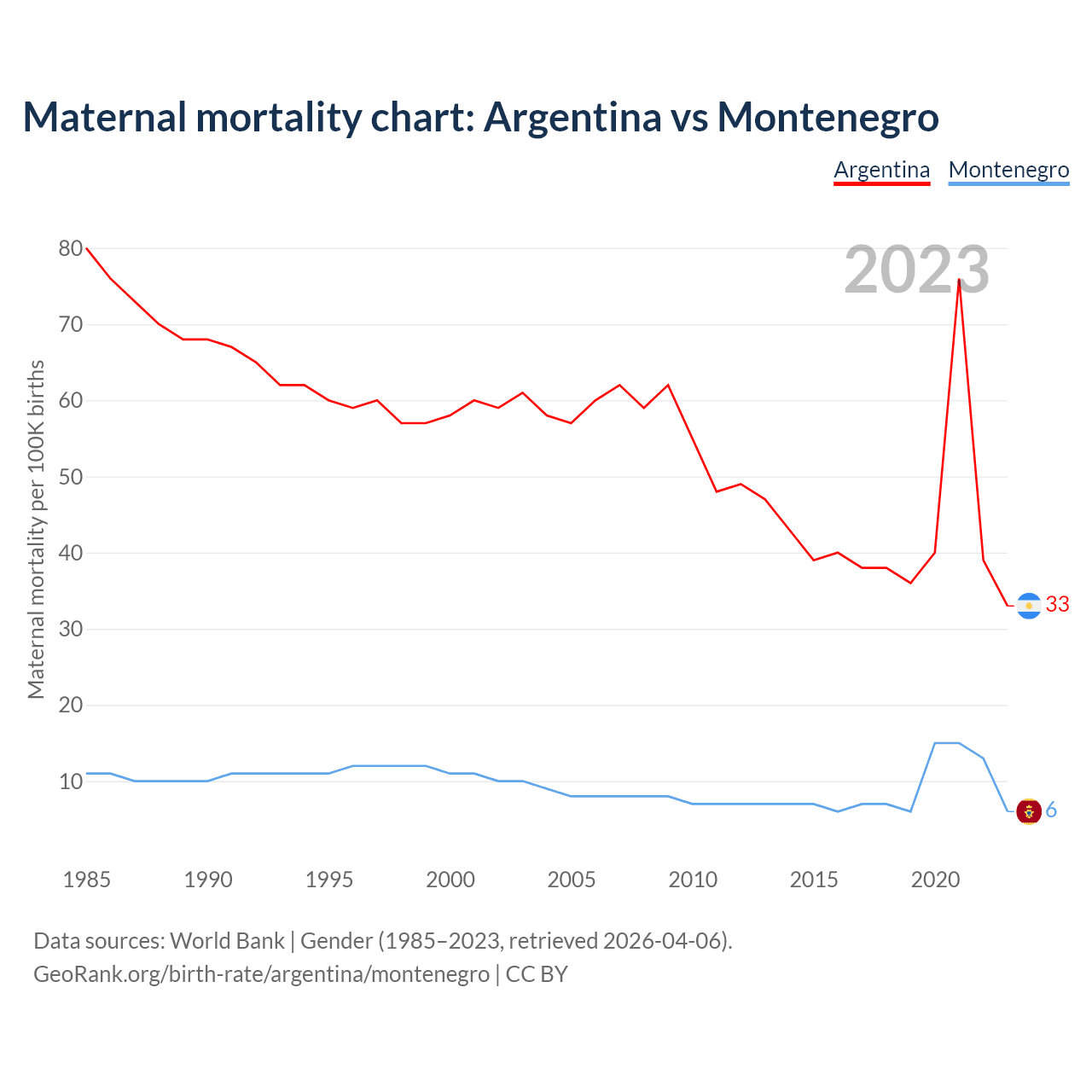 The maternal mortality rate, which is the probability of dying during childbirth or within 42 days of pregnancy termination, is 33 deaths per 100,000 live births in Argentina, compared to 6 deaths in Montenegro.