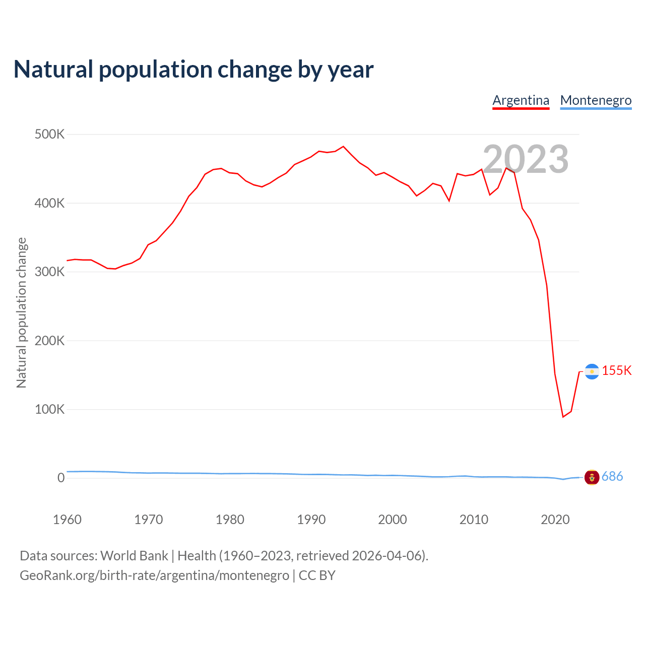According to the latest available data on birth rates, the fertility rate in Argentina was 1.5 children per woman in 2023, compared to 1.74 in Montenegro in 2023. The replacement level is considered to be 2.1 children per woman.