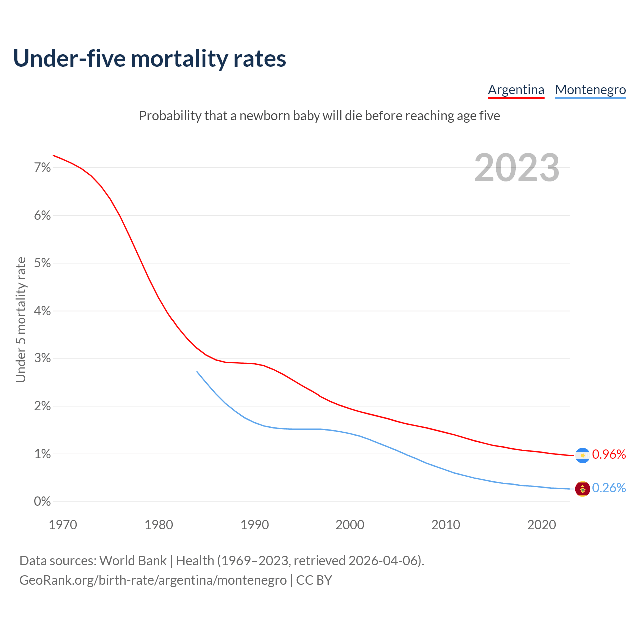 The chance that a newborn baby will die before reaching age five is 0.96% in Argentina and 0.26% in Montenegro. Above is a chart with historical data on under-five mortality rates.
